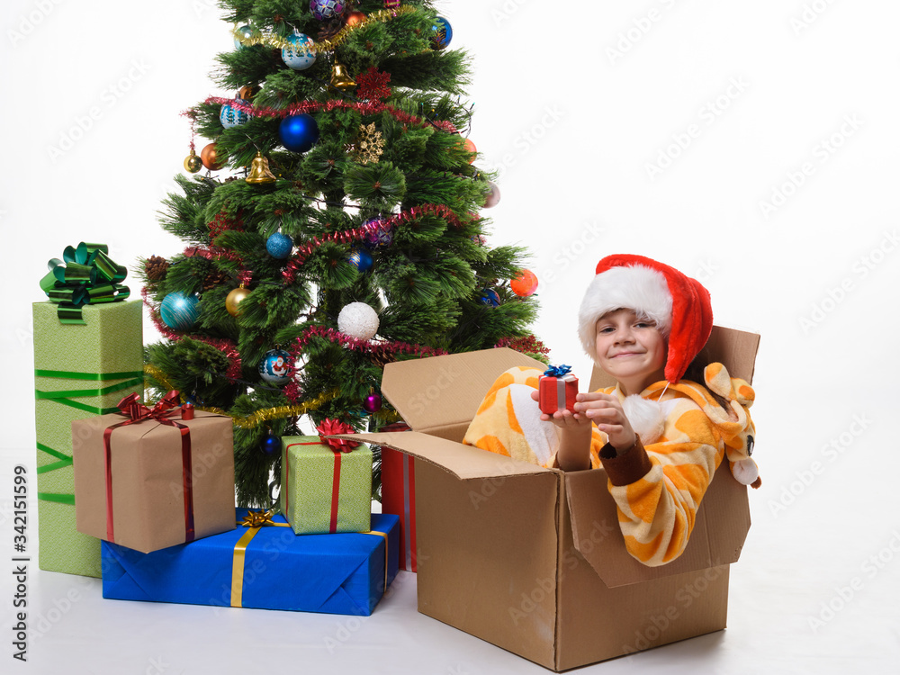 The girl climbed up and sat in a box decorating a Christmas tree