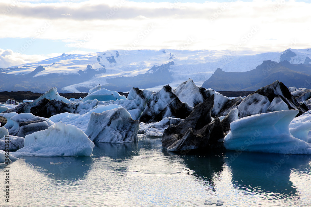 Jokulsarlon / Iceland - August 29, 2017: Ice formations and icebergs in Glacier Lagoon, Iceland, Europe