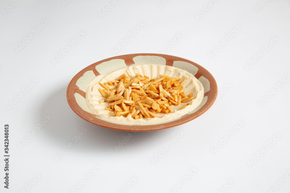 Horizontal image of Hummus meal put on plate with white background.