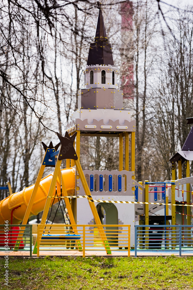 the playground is covered with a signal tape epidemic coronovirus COVID19. all small children are quarantined at home