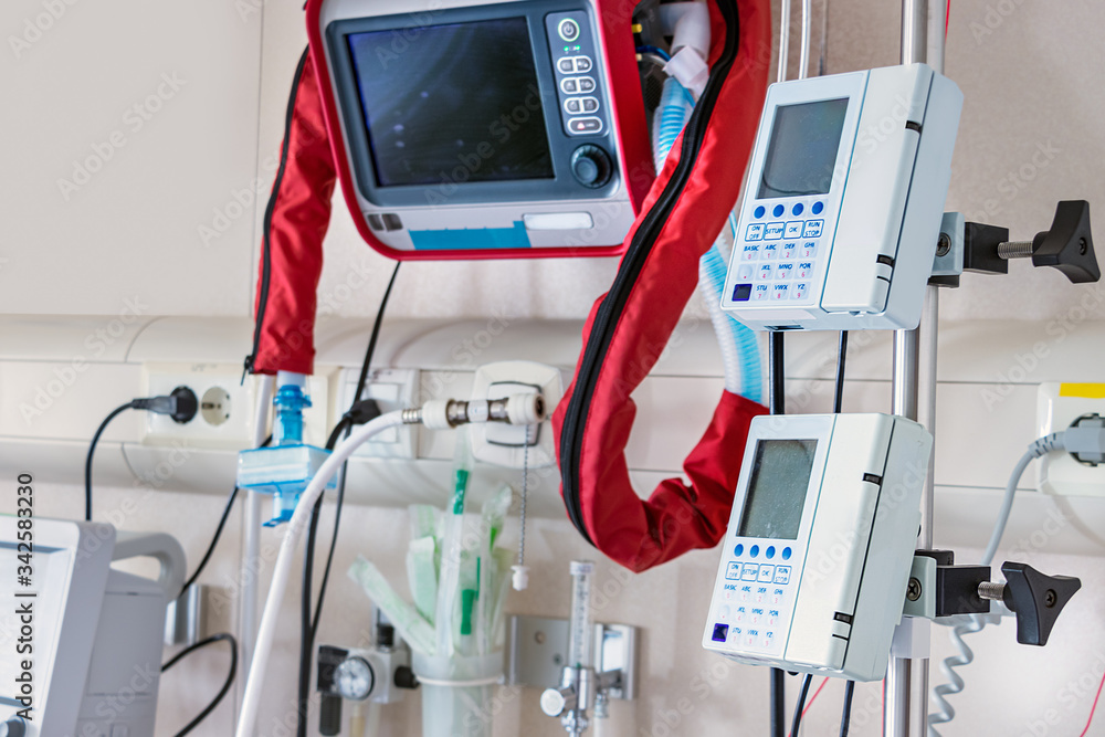 Ventilators and vital sign monitors next to Intense Care Unit bed.