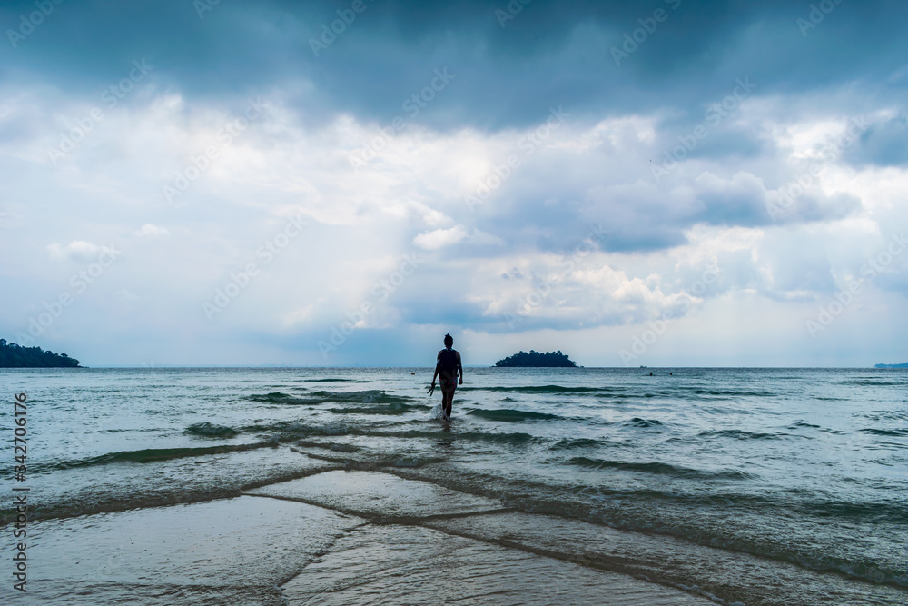 Long Set Beach, Koh Rong, Cambodia- Feb, 2020 : a woman backpacker walking into the sea at the Long Set Beach, Koh Rong, Cambodia