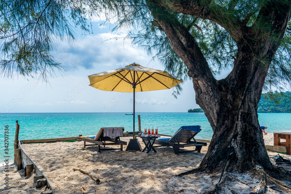 Sok San Beach, Koh Rong, Cambodia- Feb, 2020 : a wooden pier and a beautiful sunset from the Sok San Beach, Koh Rong, Cambodia