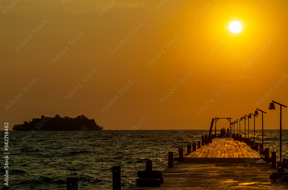 A pier with the sunrise in the background from the White Beach, Koh Rong, Cambodia