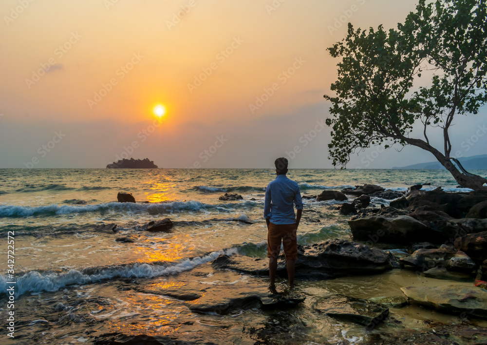 A man enjoying a beautiful sunrise from the White Beach, Koh Rong, Cambodia