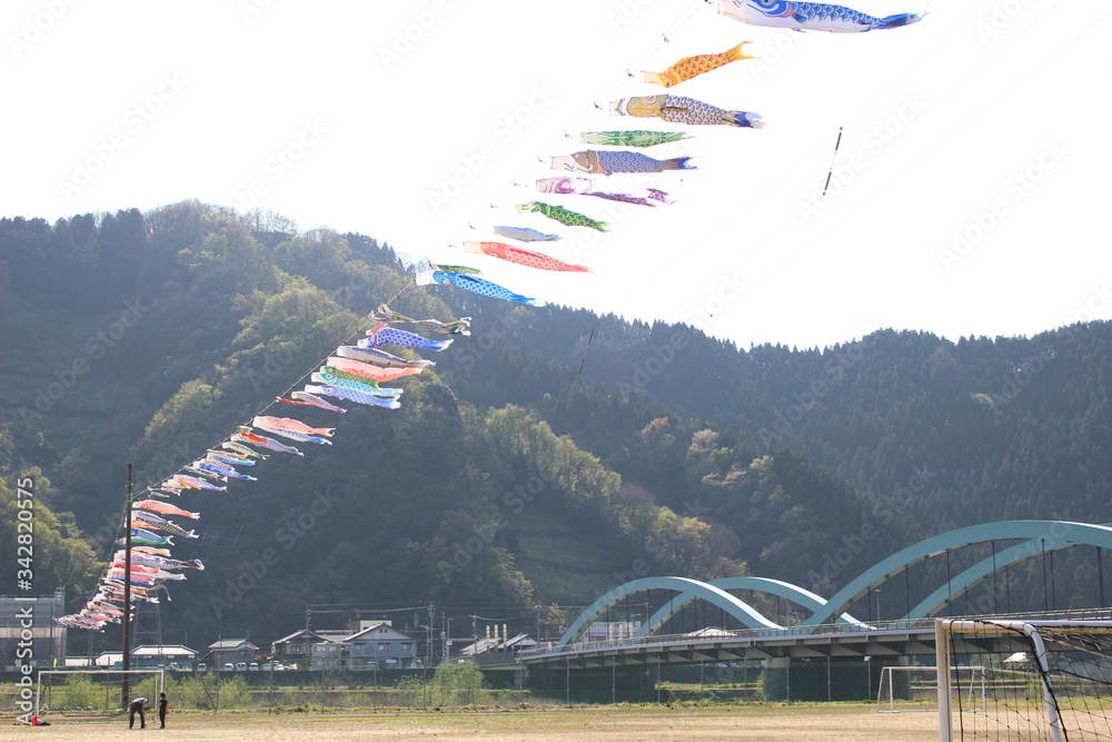 九頭竜川上空を泳ぐ鯉のぼり(福井県勝山市)