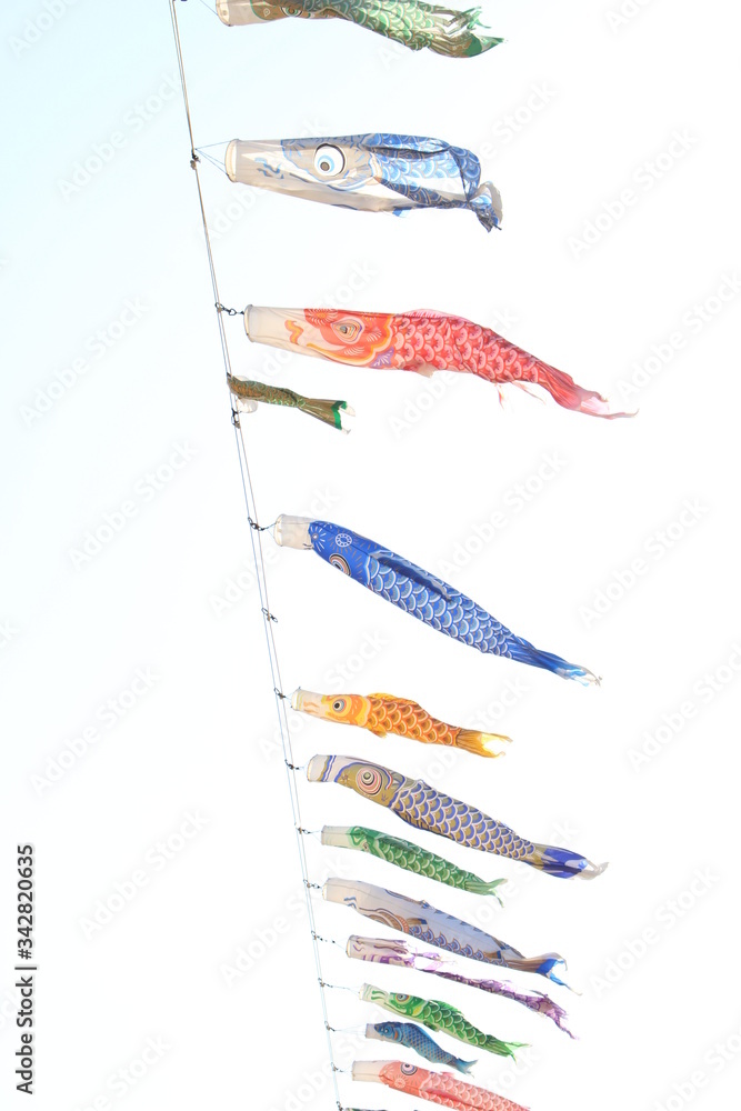 九頭竜川上空を泳ぐ鯉のぼり(福井県勝山市)
