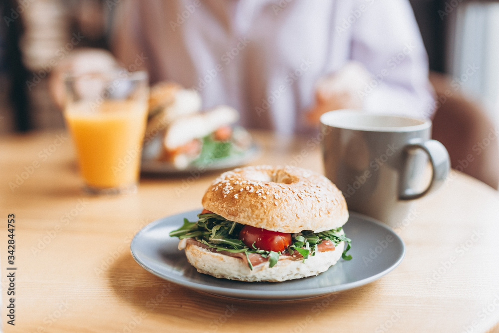 delicious and appetizing breakfast: a bagel stuffed on a plate