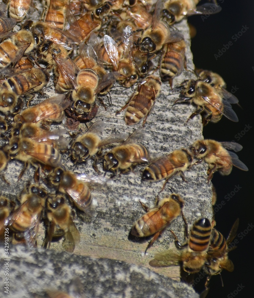 A swarm of bees (Apis mellifera) gathered on a wooden walkway along Elkhorn Sough in California.