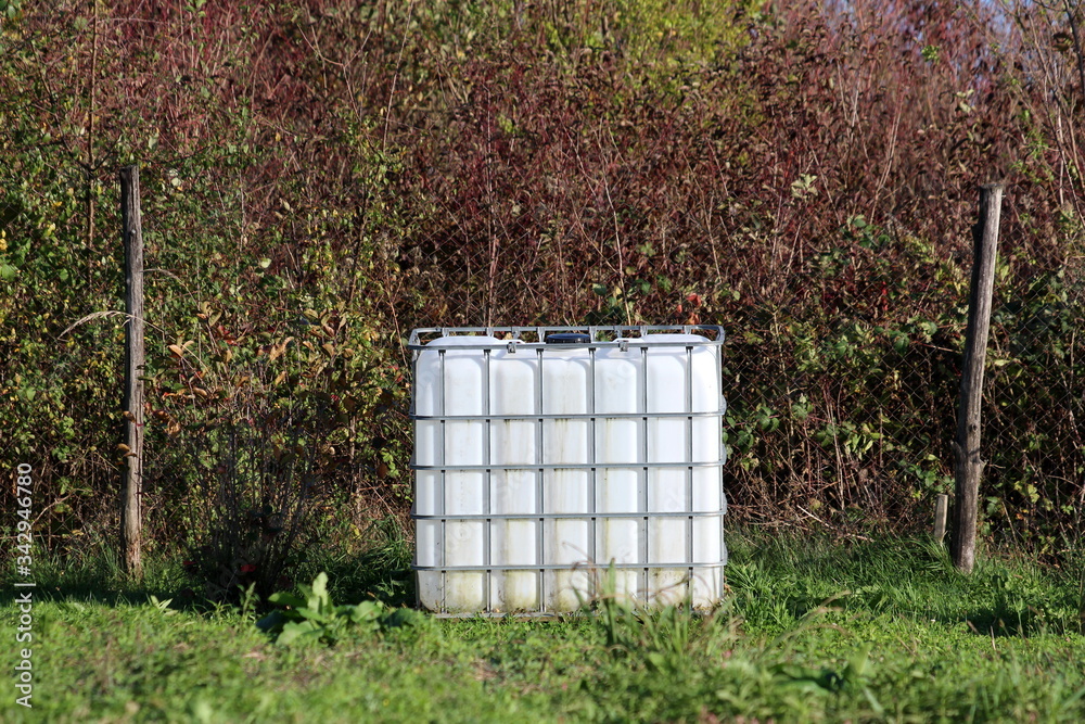 White new intermediate bulk container or IBC plastic tank with metal cage used for water storage left in family house backyard garden next to two wooden fence poles surrounded with uncut grass and den