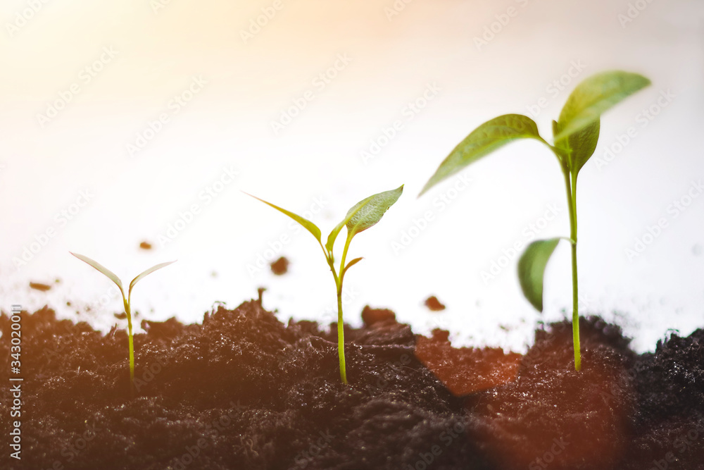 Young green nature sprouts in the soil is growing up. ecology and agriculture concept. Pumpkin seedlings are growing from the soil and there is a morning shining.