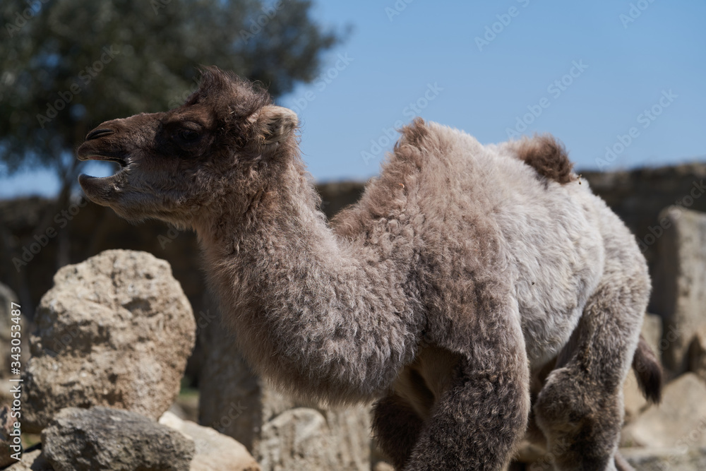 Bactrian camel family. Camel and camel colt on farm, outdoors