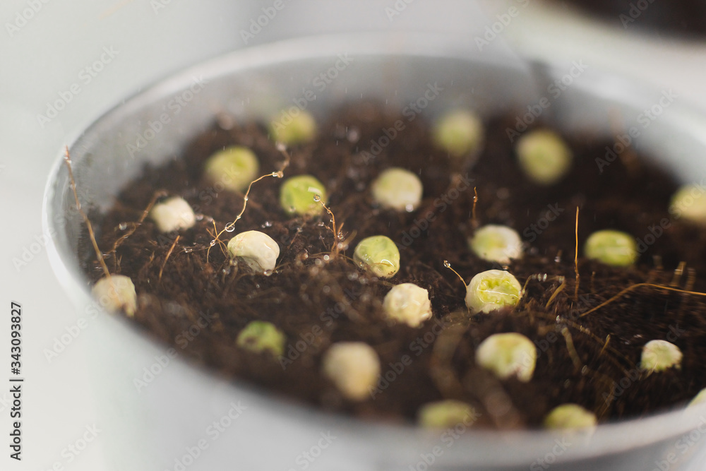 sowing peas in a row concept. gardening. hobby. quarantine. Growing home micro greens