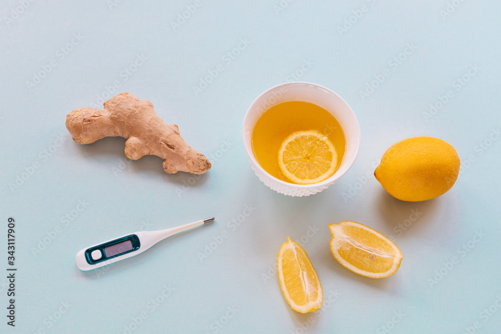 Cup of tea with Lemon and Ginger and termometer on blue background. Home remedies concept. Top view