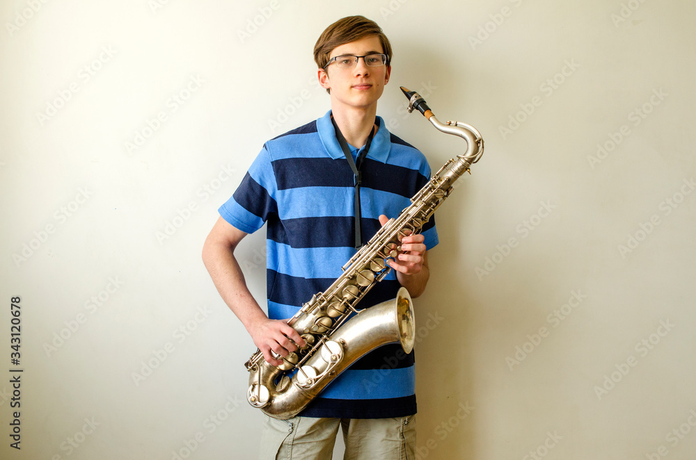 Young saxophonist plays tenor saxophone in a striped blue shirt on a white background