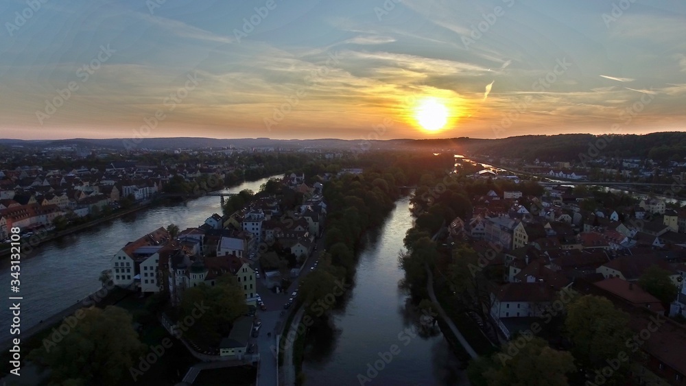 Luftaufnahme im Sommer über der Stadt Regensburg bei herrlichem Sonnenuntergang