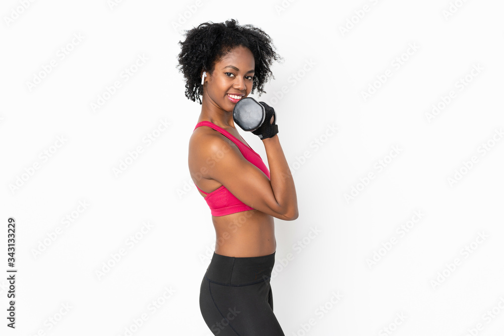 Young African American woman isolated on white background making weightlifting