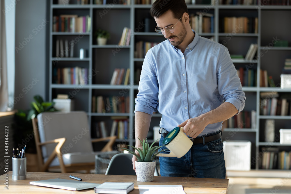 Confident businessman wearing glasses watering plant on work desk, serious focused man holding plastic pot with water, standing near table in modern office cabinet, new startup project