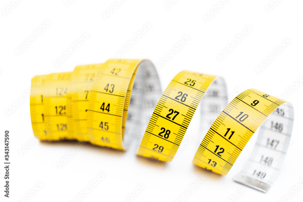 Yellow measuring tape on white background. Measurement of length and circumference. Lose weight and get fat.