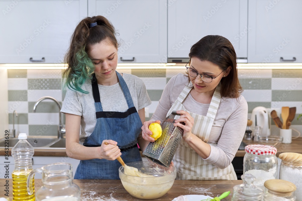 Mother and teenager daughter cook together at home in kitchen