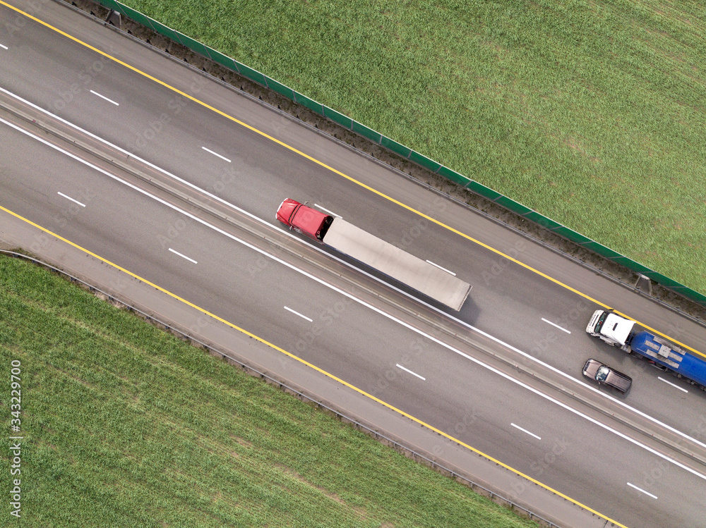 Dump trucks carrying goods on the highway. Red truck driving on asphalt road along the green fields. seen from the air. Aerial view landscape. drone photography. cargo delivery