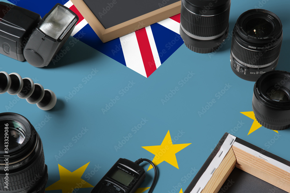 Tuvalu national flag with top view of personal photographer equipment and tools on white wooden table, copy space.