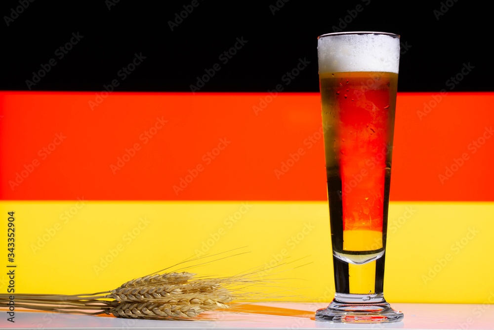 A lager style beer in a tall glass with a wheat or barley sheaf and a German flag background.