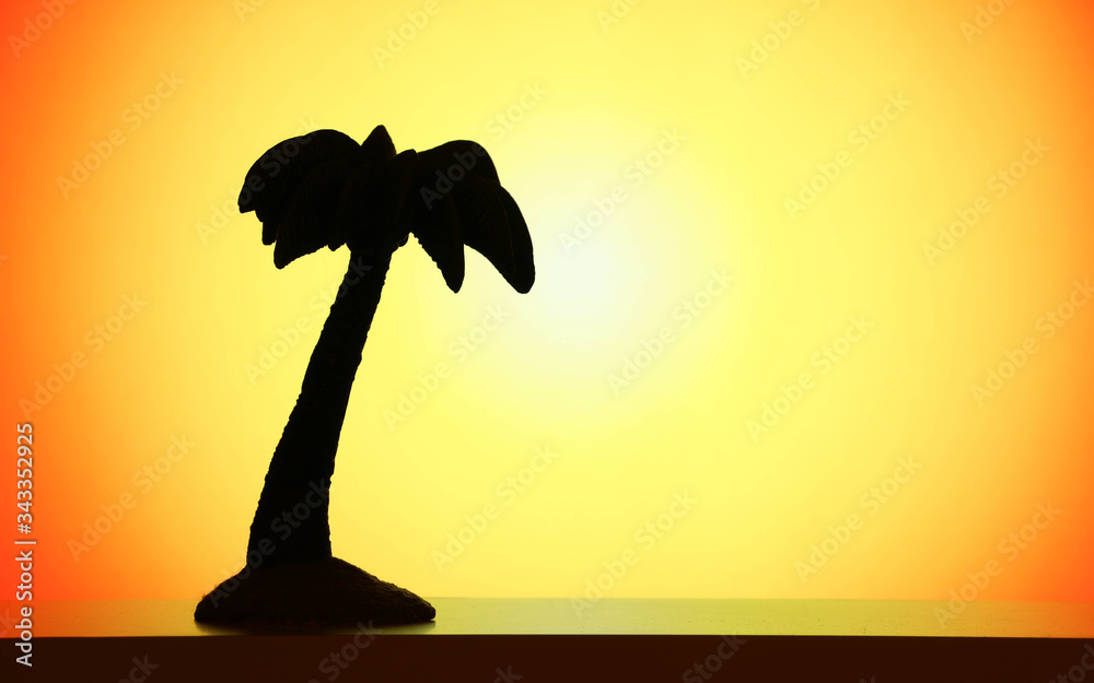 A palm tree design decoration silhouette on a orange and yellow gradient background that resembles a warm sunshine glow and copy space.