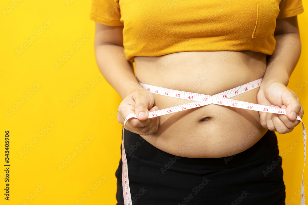 fat woman check out body overweight abdomen she belly with in hand measuring tape for yellow or obesity background. Weight loss concept.