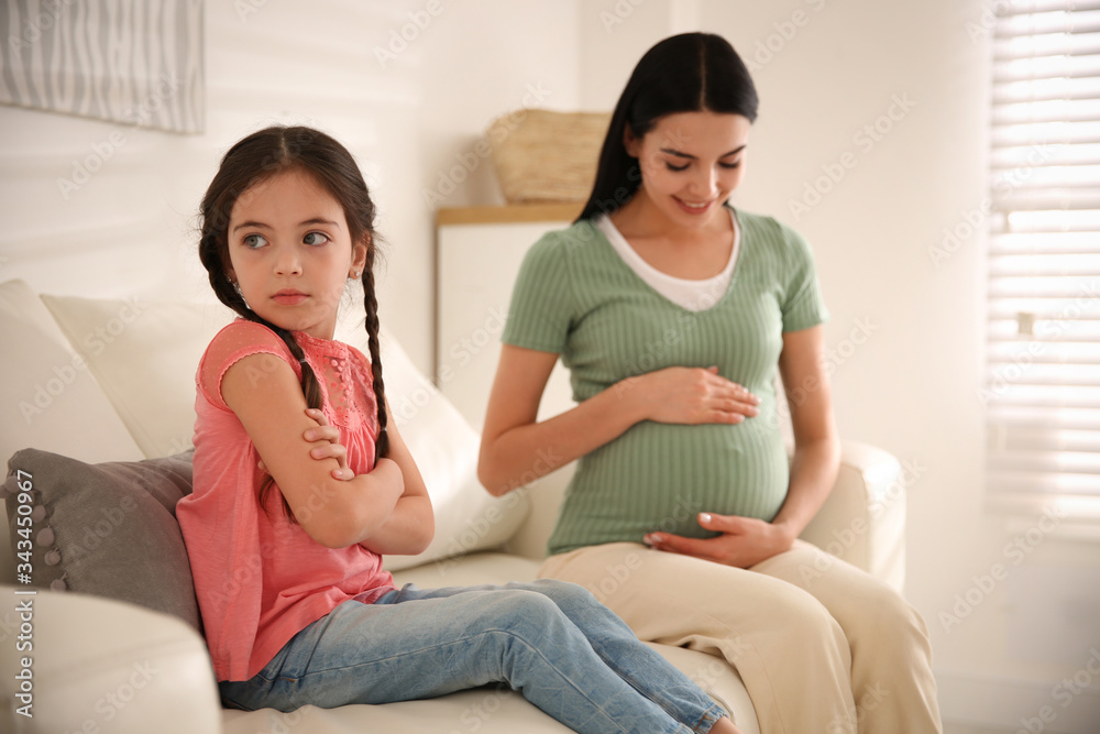 Unhappy little girl near pregnant mother at home. Feeling jealous towards unborn sibling