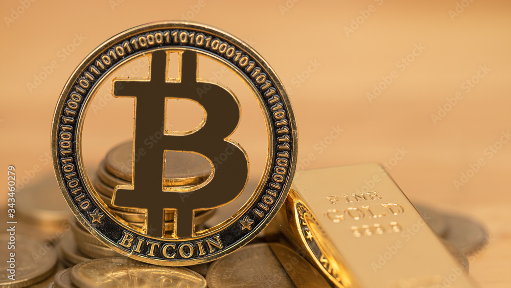 Bitcoin coin and gold bar Placed on pile of money. Concept Investors will accumulate gold or digital money.