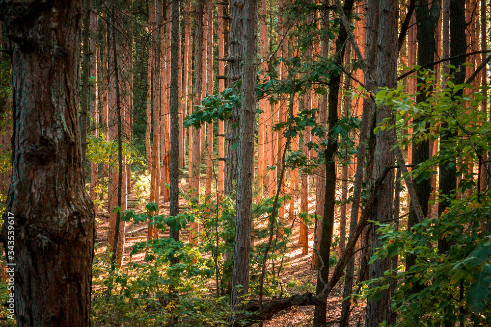 Sun peaking through the trees in a forest in Michigan