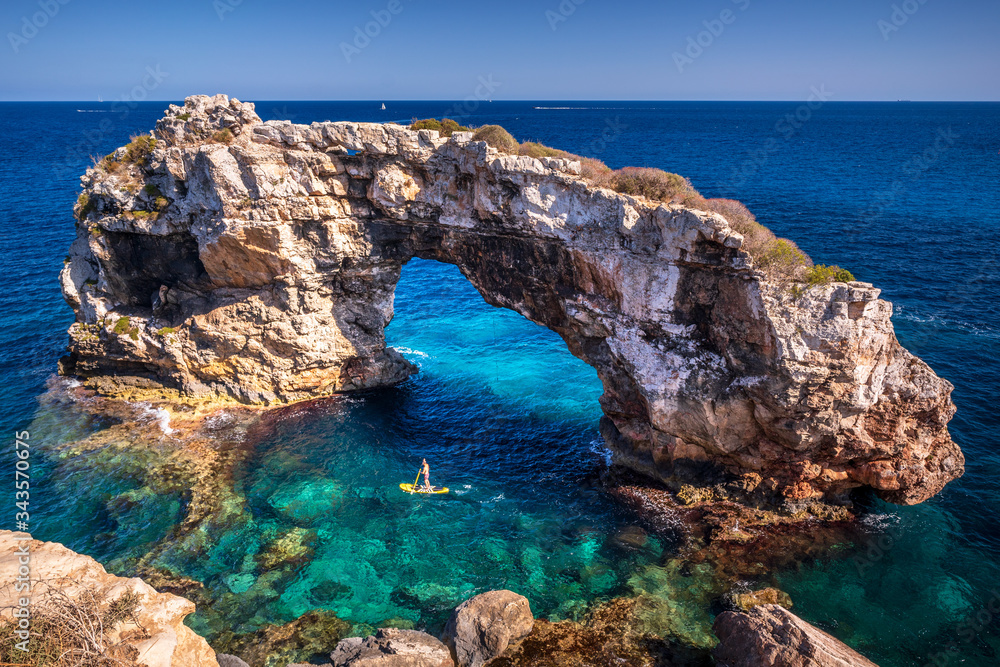 Blue water and sunny day at the Beautiful nature wonder in Palma de Mallorca. Es Pontas natural rock formations in Palma de Mallorca, Balearic Islands