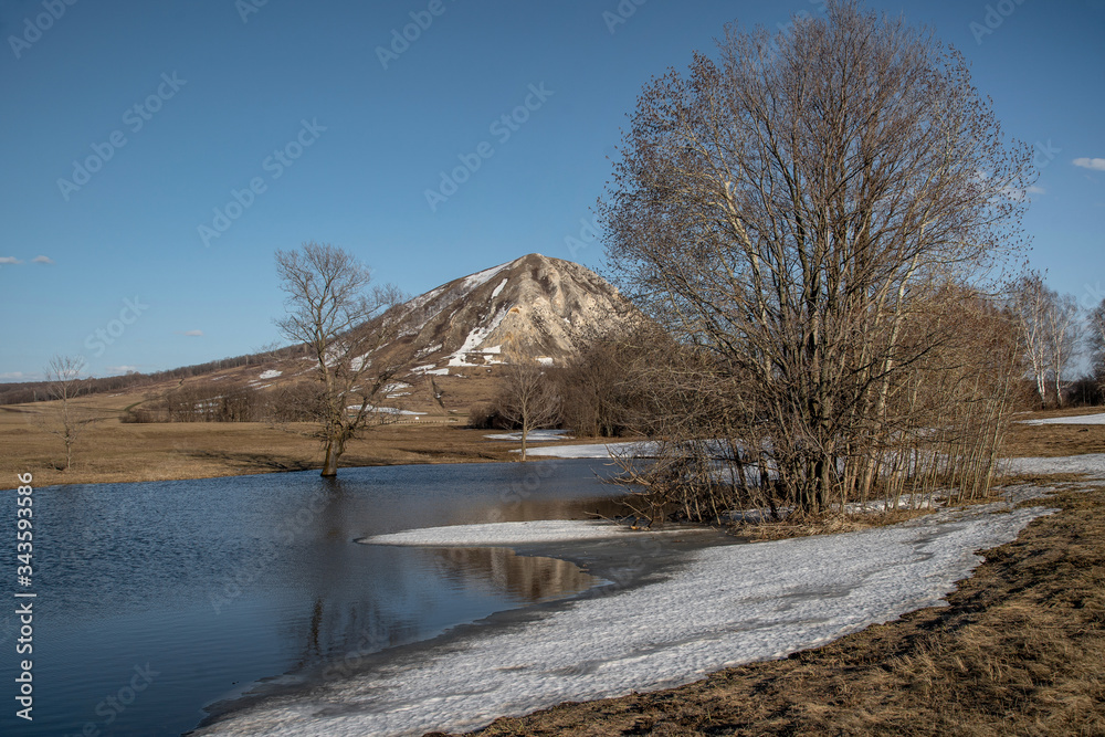 Spring landscape of Bashkortostan. A lonely mountain, a shihan, around a plain, rare trees and snow and melt water in gullies.