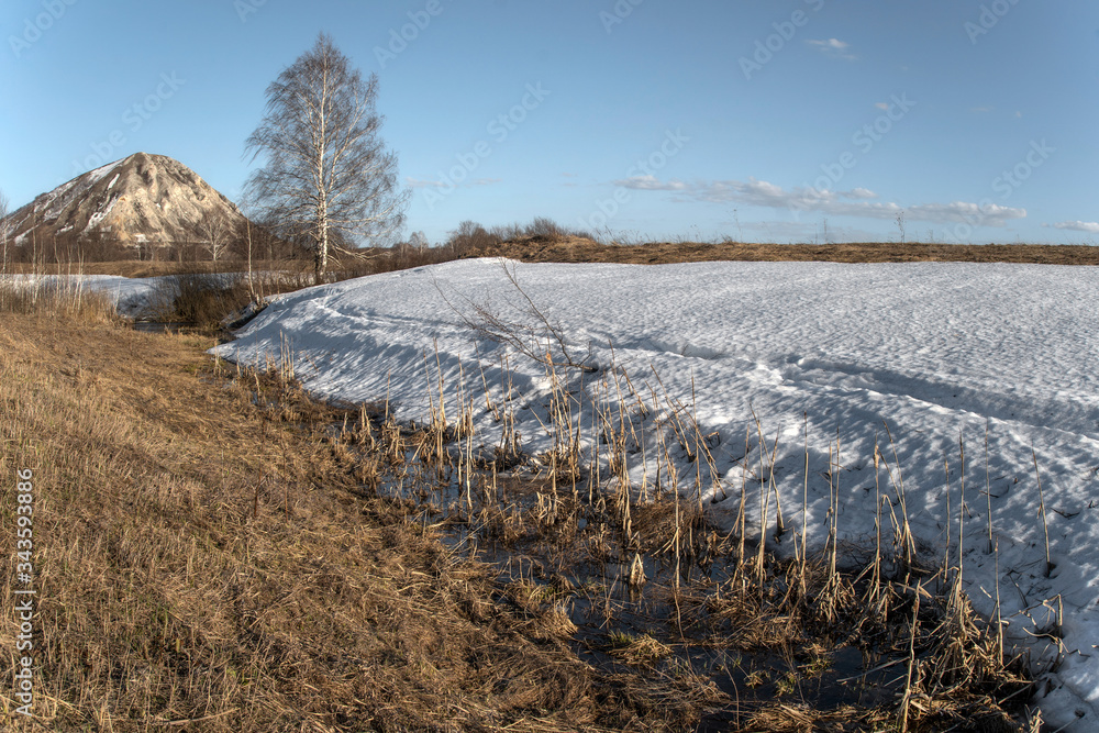 Spring landscape of Bashkortostan. A lonely mountain, a shihan, around a plain, rare trees and snow in gullies.