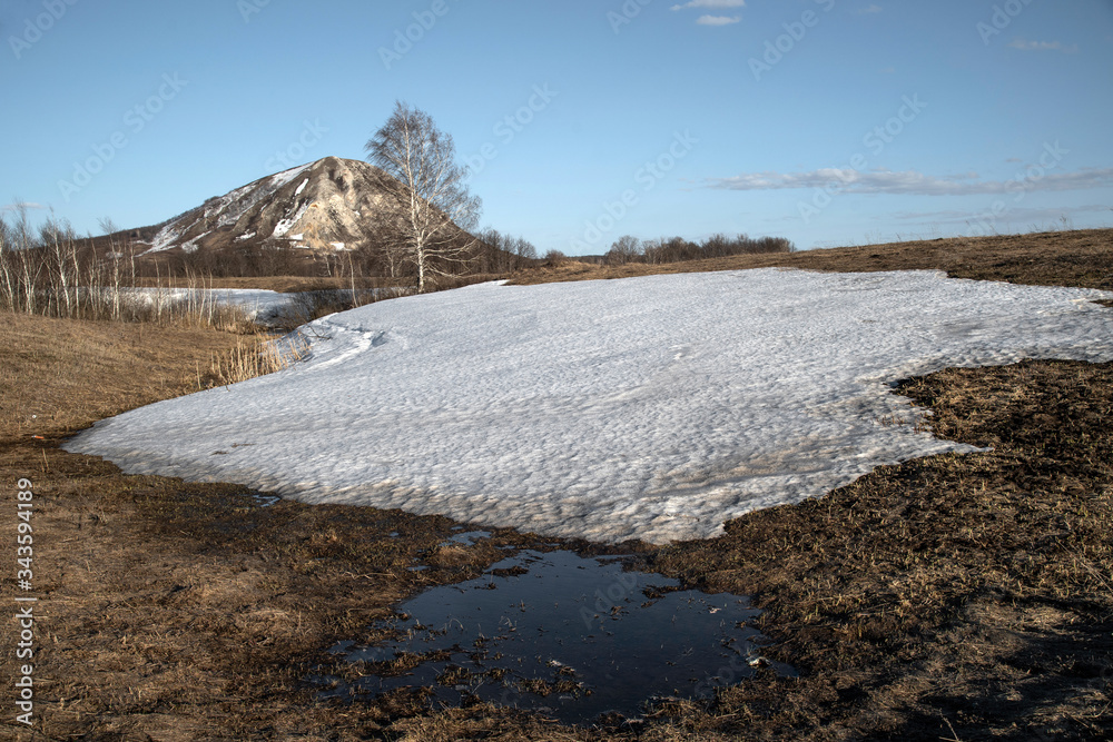 Spring landscape of Bashkortostan. A lonely mountain, a shihan, around a plain, rare trees and snow in gullies.