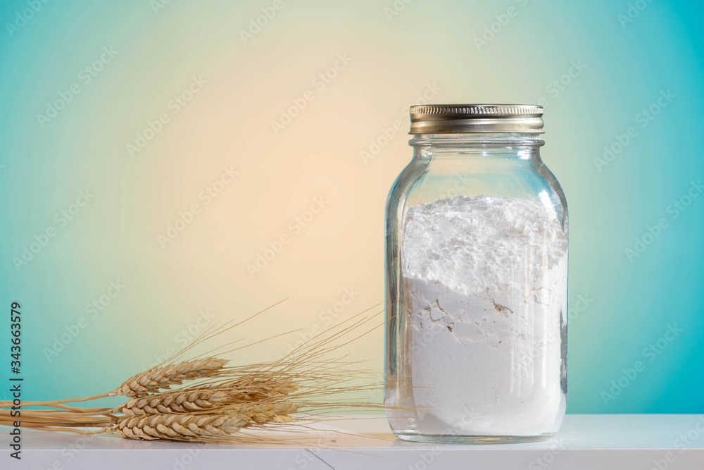 White flour in a glass jar and wheat sheaf with modern clean blue gradient background.