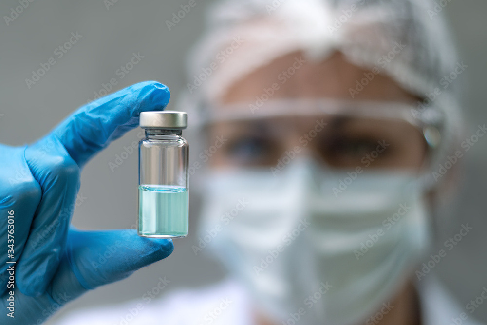 Biology and science. Scientist holding a vaccine vial. Global alert. Vaccination. Covid-19. Coronavirus. Research.