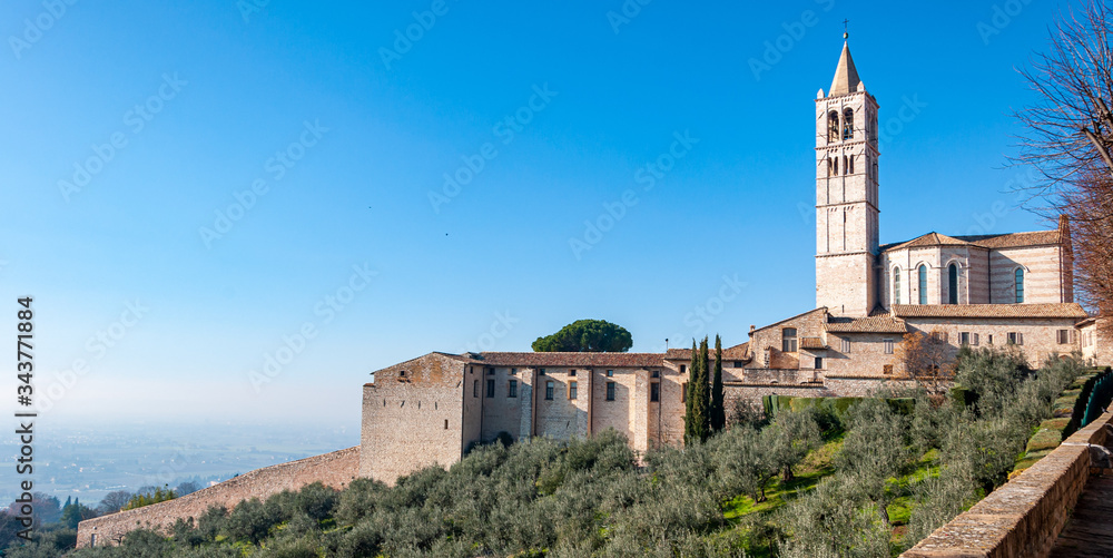 Assisi, the city of peace, Italy. UNESCO World Heritage Site, the birthplace of Saint Francis. View of the Basilica of Saint Chiara and the hill with olive trees in front.