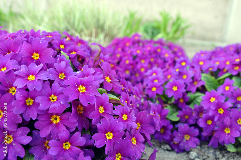 Primrose ordinary (Primula vulgaris), or primrose in the spring garden. Beautiful lilac primrose flowers bloom garden.