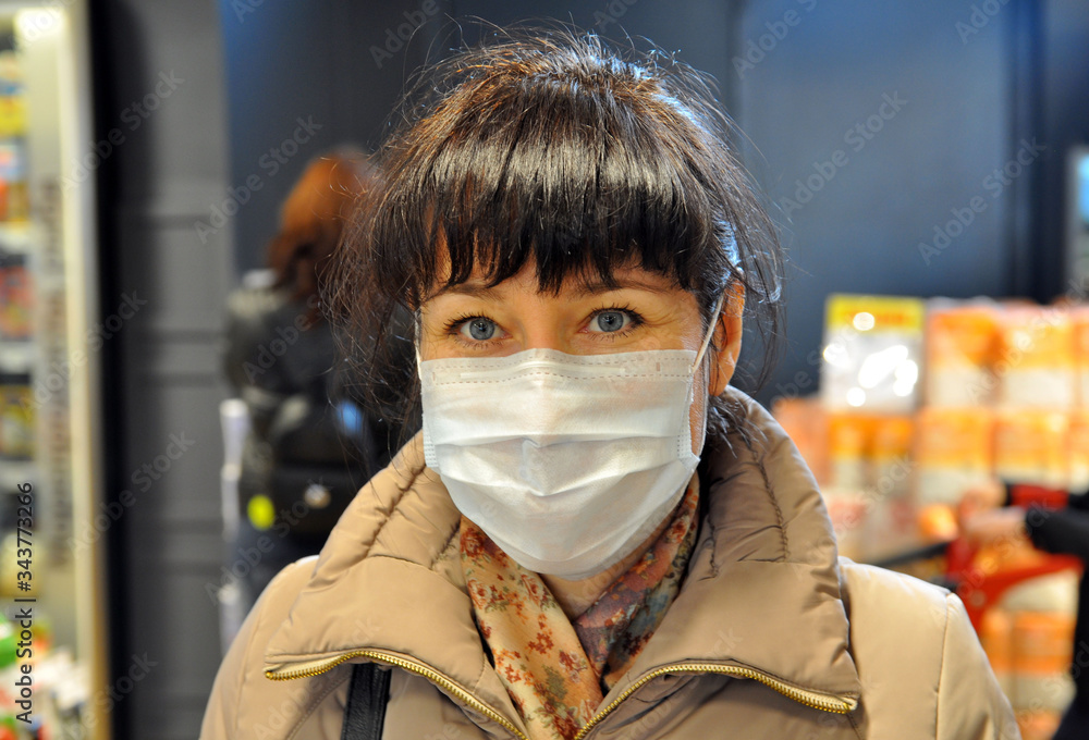 Young woman wearing disposable medical mask shopping in supermarket during coronavirus pneumonia outbreak. Protection and prevent measures while epidemic time.