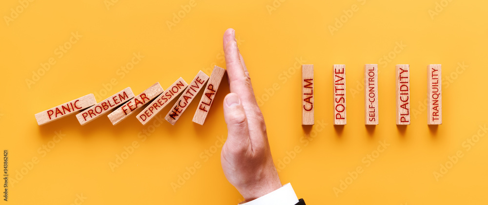 the hand stops the falling blocks with negative inscriptions and builds positive blocks. good news concept