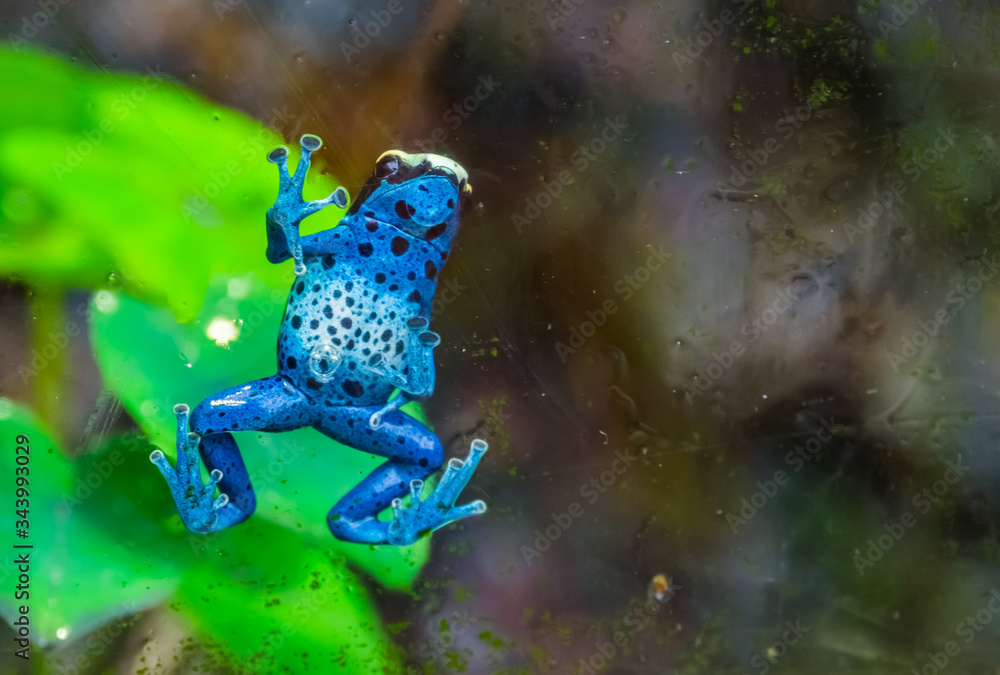 funny closeup of a blue poison dart frog climbing against the window, tropical amphibian specie from Suriname, South America
