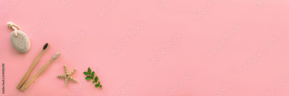 Flat lay accessories for hygiene and body care: pumice stone, wooden toothbrushes with starfish and green leaves on pink background. Zero waste concept. Top view, flat lay, copy space.