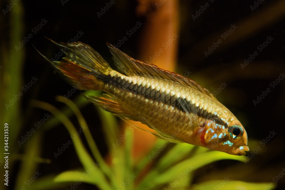 adult wild male Apistogramma mendezi, rare freshwater dwarf cichlid in full coloration, blackwater Rio Negro biotope aquadesign, low pH acidic habitat