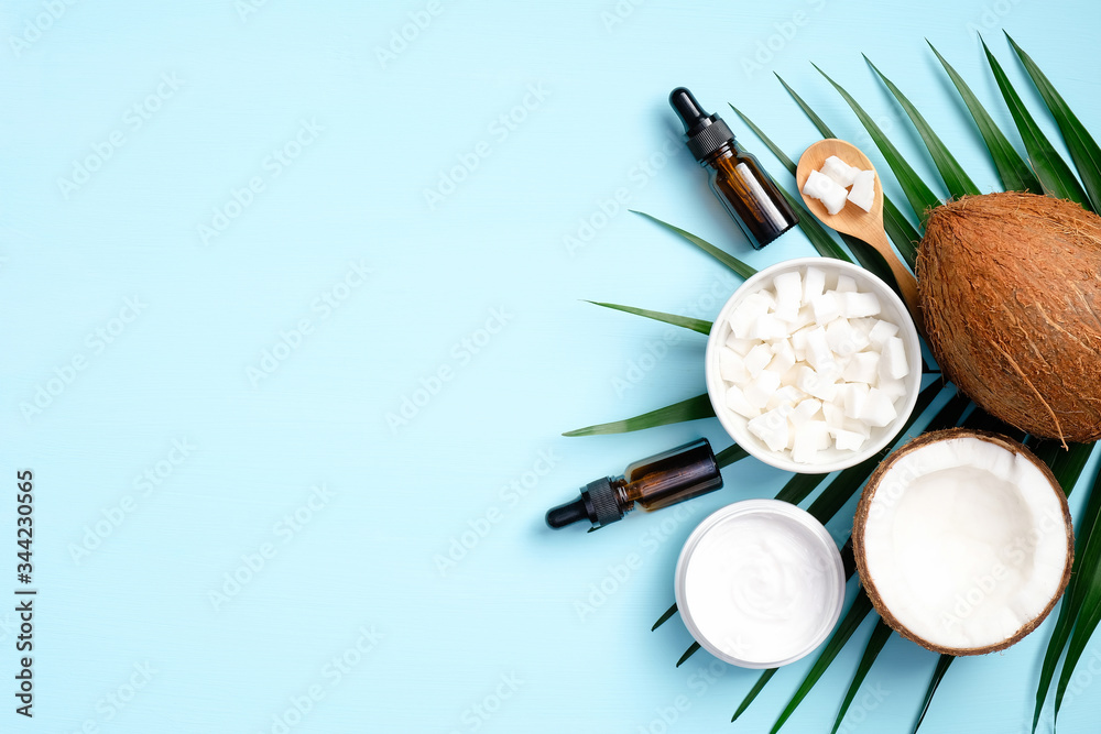 Flat lay composition with coconut oil cosmetics and tropical palm leaf on blue background. Top view coconut, green leaf, sliced coconut, organic hand cream, natural homemade essential oils.