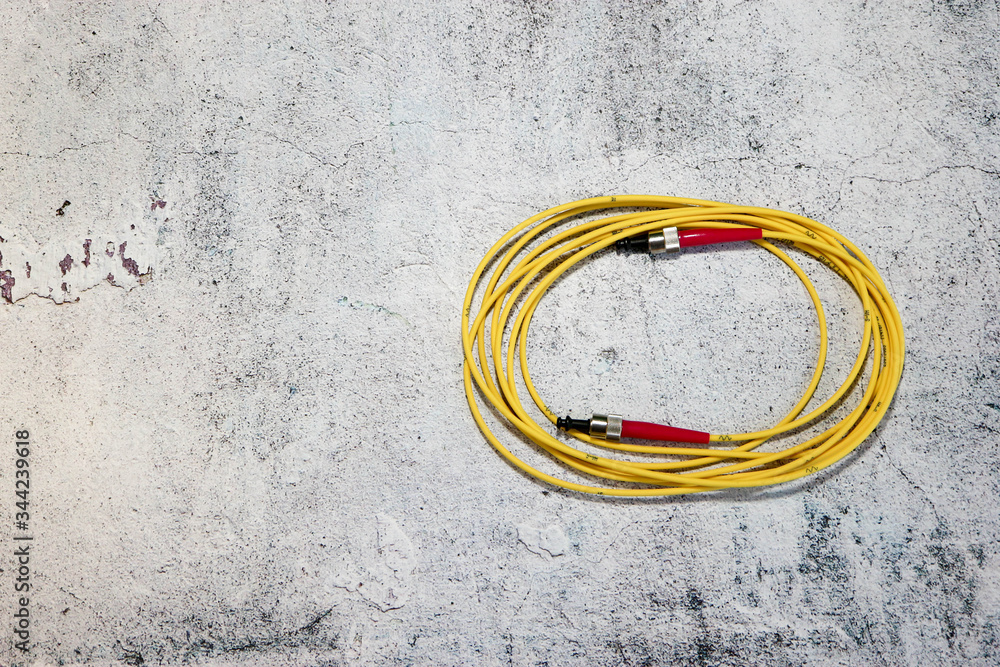 yellow fiber optic cable with red connectors on grey background