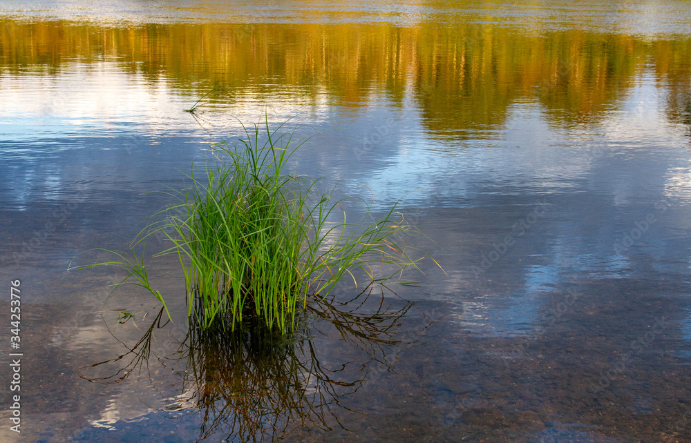 Grass growing along river banks and in the water. Bright evening light, reflection of partings in the water.