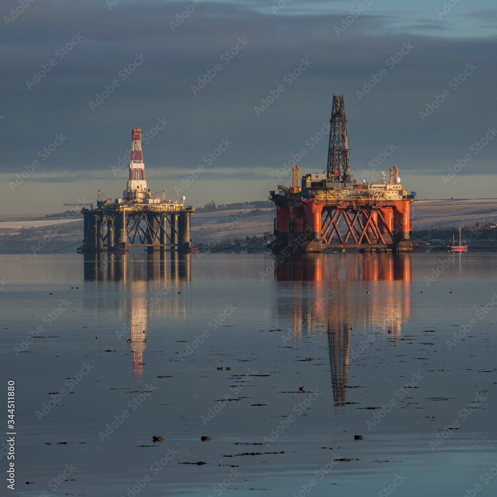 Tranquil industrial winter scene of Oil Rigs on the Cromarty Firth