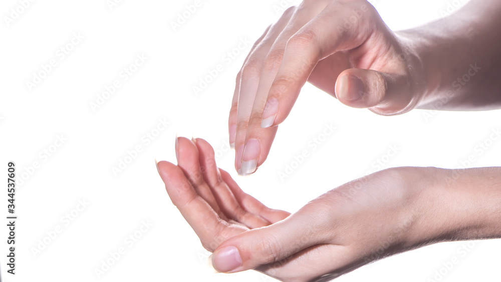 Women's hands on a white background isolated with copy space or mockup. A girl with long nails and beautiful hands.